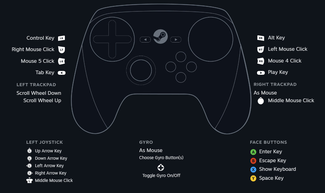 The answer is Steam Input, Valve’s own input API built for the Steam Controller. Briefly put, it allows you to assign keyboard and mouse inputs (and more!) to the controller, finally bridging the gap between PC controls and couch play. It’s what let me use the gyro and trackpads as a mouse in the video above!